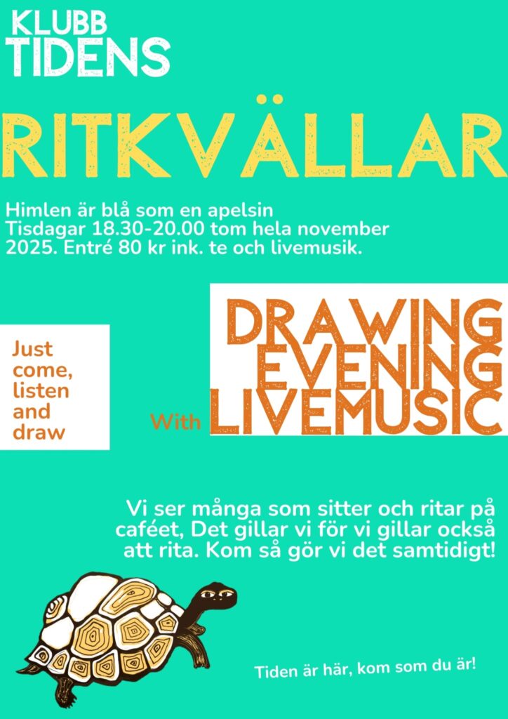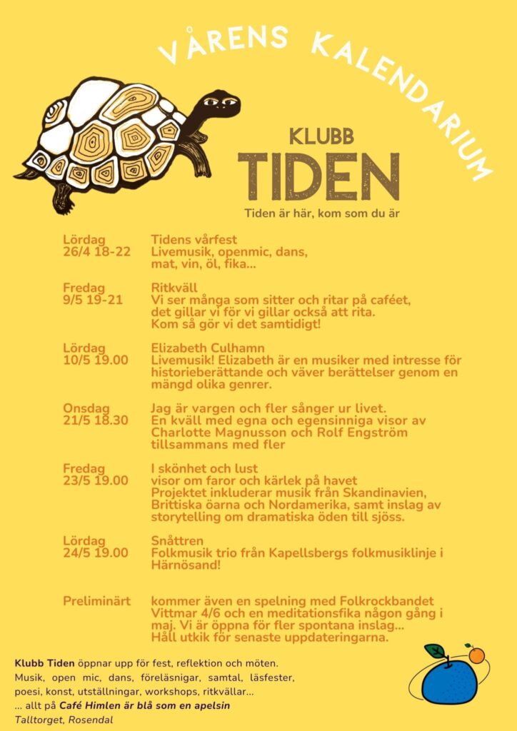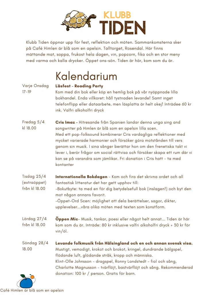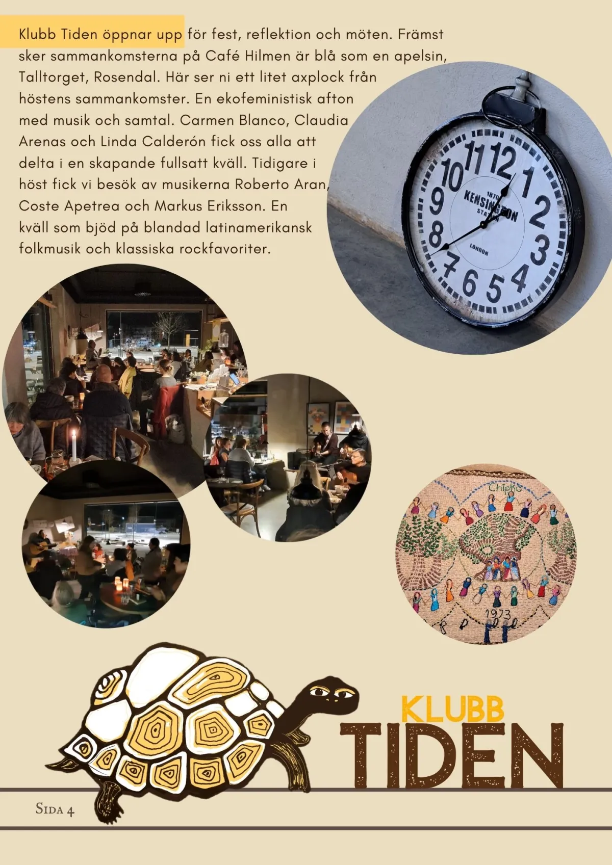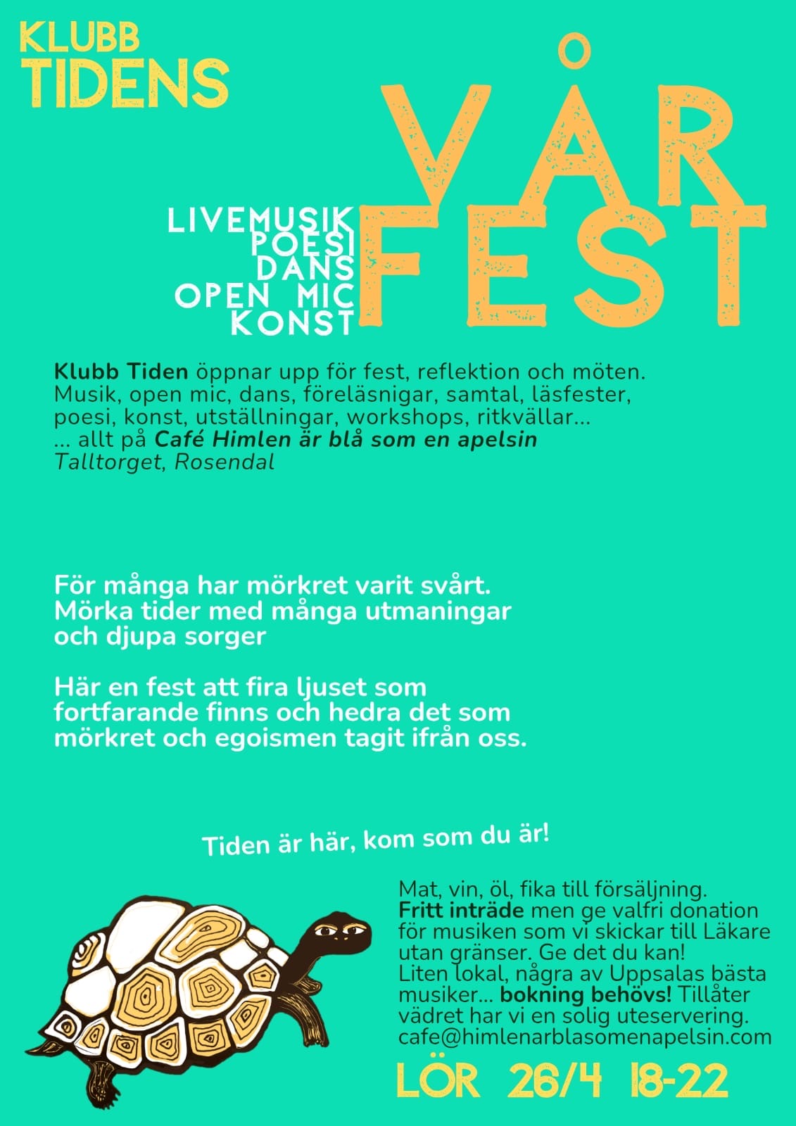 Klubb Tiden öppnar upp för fest, reflektion och möten. Musik, open mic, dans, föreläsningar, samtal, läsfester, poesi, konst, utställningar, workshops, ritkvällar…