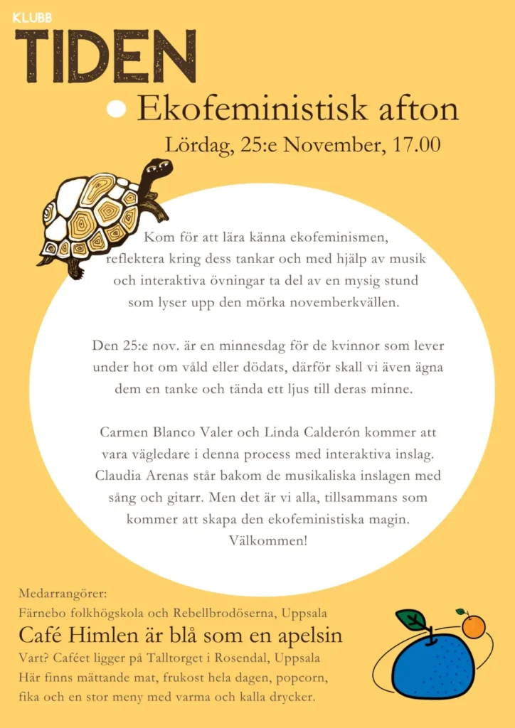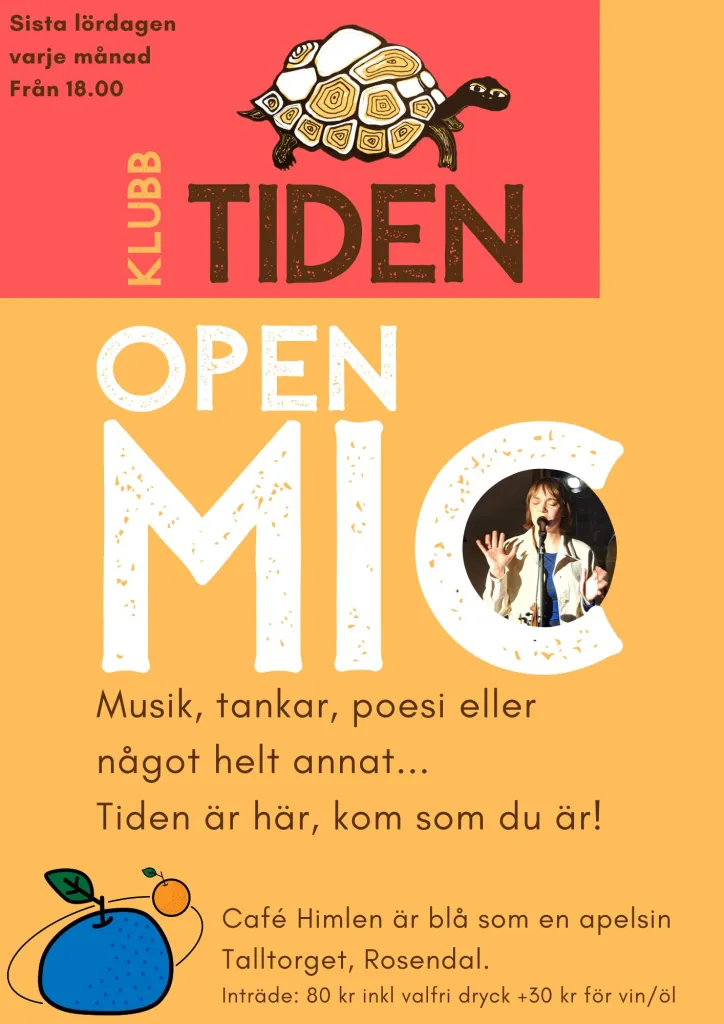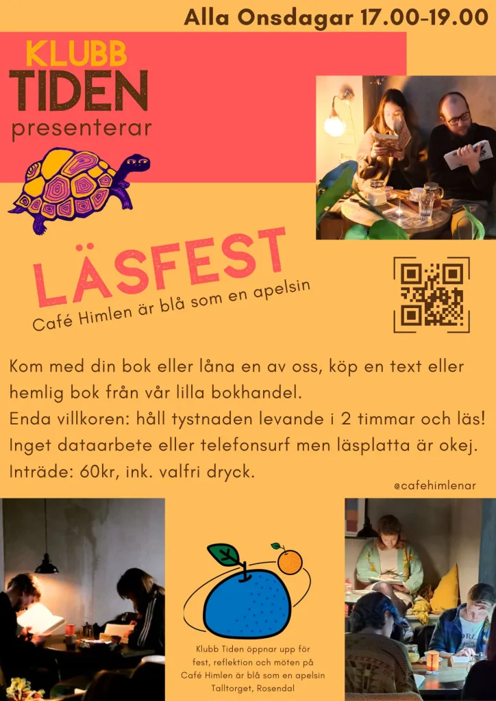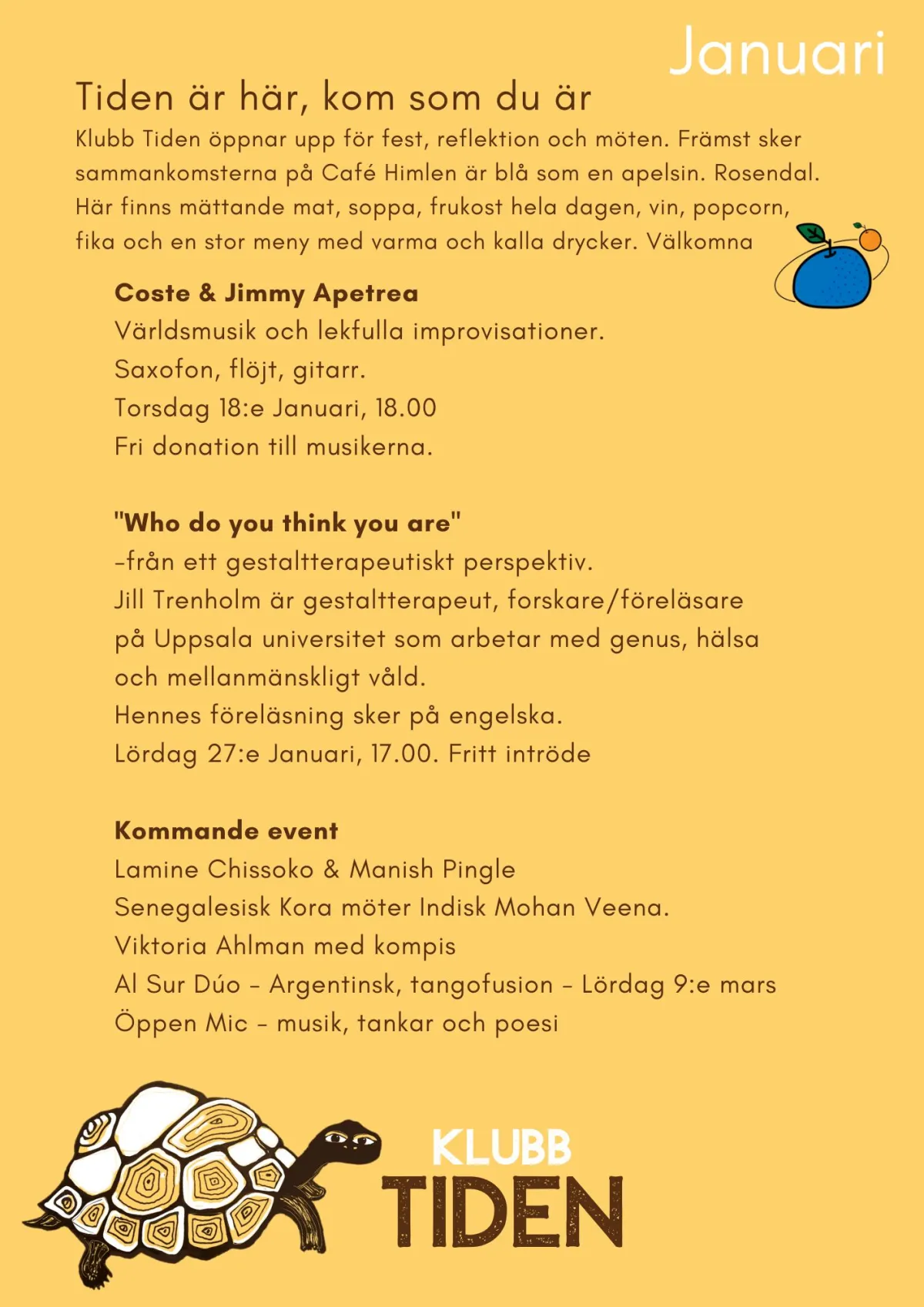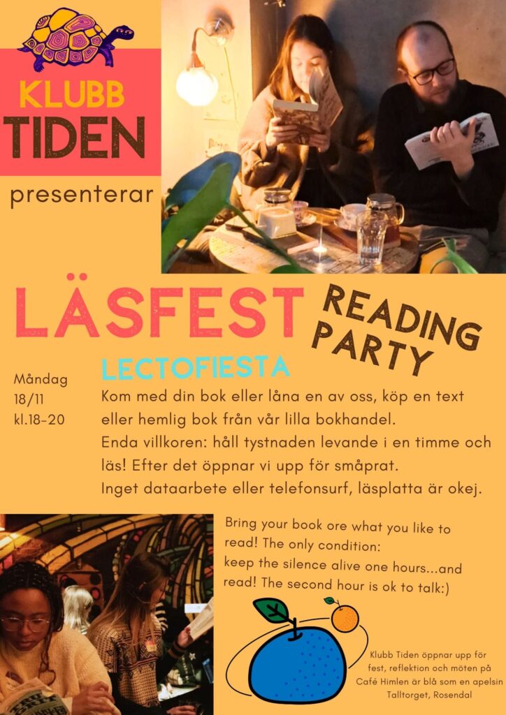 Klubb Tiden öppnar upp för fest, reflektion och möten. Musik, open mic, dans, föreläsningar, samtal, läsfester, poesi, konst, utställningar, workshops, ritkvällar…